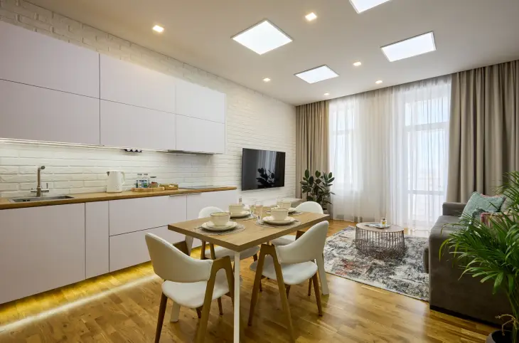 Стильные трехкомнатные апартаменты в Гродно на улице Свердлова идеально подходят для комфортного размещения до 6 человек. Жилье расположено на 4 этаже нового пятиэтажного дома (без лифта) и отличается высоким уровнем сервиса. Планировка включает две полностью оборудованные изолированные спальни и гостиную с большим раскладным диваном. Кухня оснащена всей необходимой бытовой техникой для длительного проживания: есть варочная панель, духовой шкаф, микроволновая печь, посудомоечная машина, холодильник и электрический чайник. Предусмотрен полный набор посуды и столовых приборов. В ванной комнате подготовлены средства гигиены и фен. Для удобства гостей установлены стиральная и сушильная машины. Также в распоряжении проживающих утюг, телевизор и бесплатный Wi-Fi. В квартире есть балкон и лоджия. Дом находится в районе с развитой инфраструктурой: в шаговой доступности работают продуктовый магазин, аптека и кафе. Удобное расположение позволяет быстро добраться до главных достопримечательностей города.